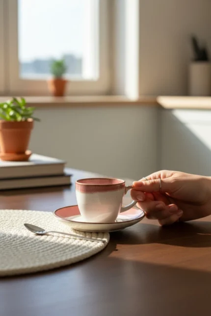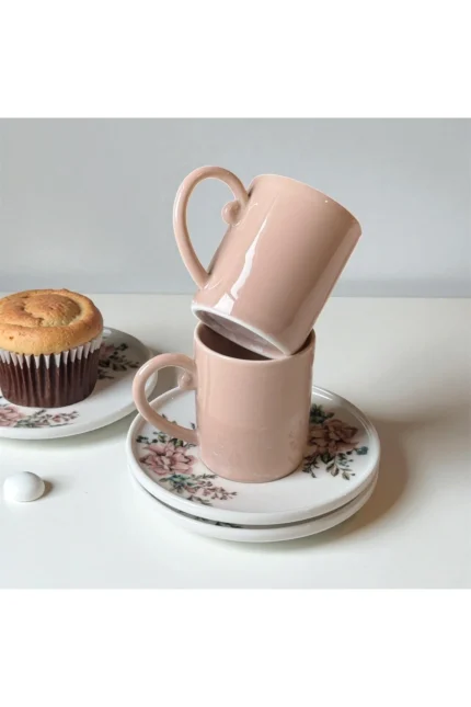 Rustik Stoneware 2’li Porselen Kahve Fincan Takımı – Doğal Dokulu – Pembe Luna