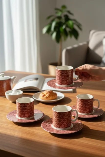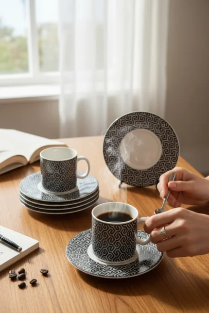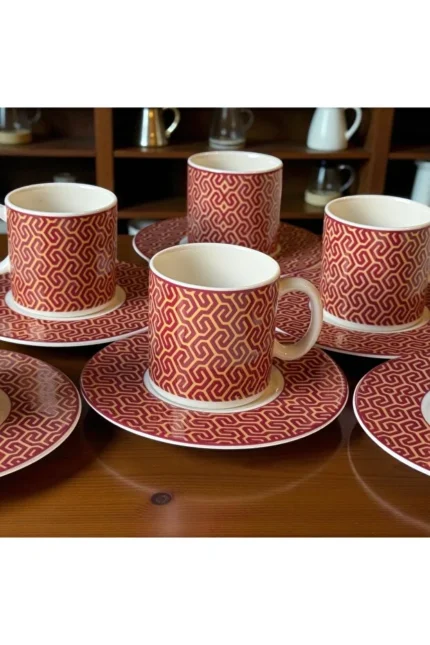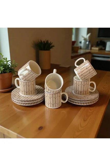 Line 12 Parça Desenli Porselen Kahve Fincan Takımı | 6 Kişilik