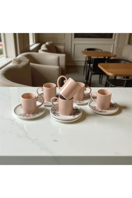 Pink 12 Parça Desenli Porselen Kahve Fincan Takımı | 6 Kişilik